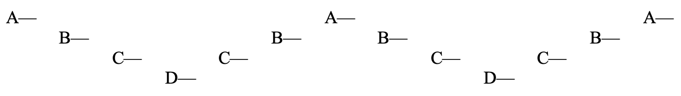Diallelon is essentially a nested detective novel. There are four narrators—A, B, C, and D—each of whom, starting with B, is following or investigating the previous narrator. Structurally, we move from A to D in order, then back to A, then back to D, then back to A again. Visually, the movement between narrators looks like this: